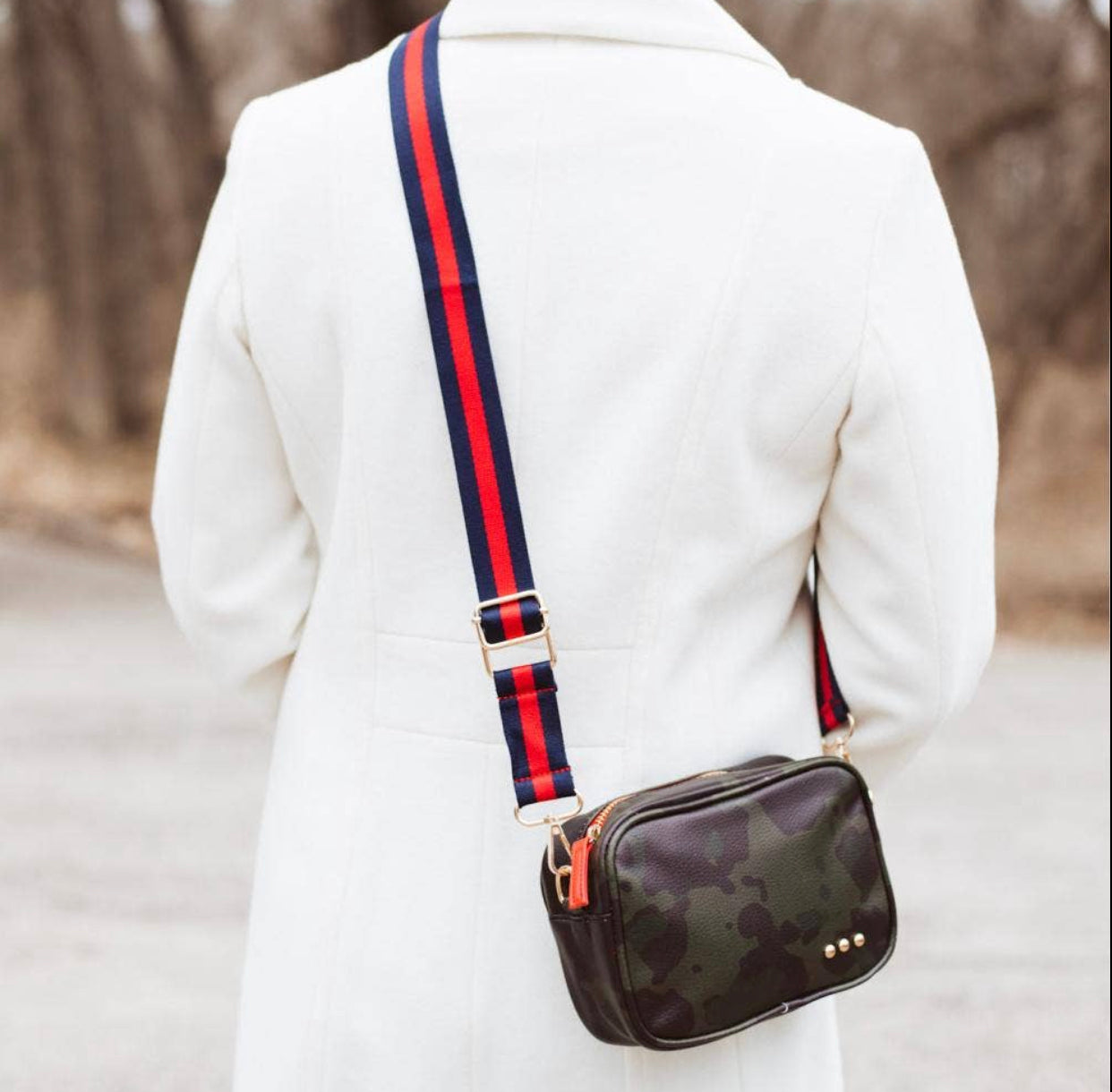 Faux leather crossbody bag with perfect red and blue removable strap!